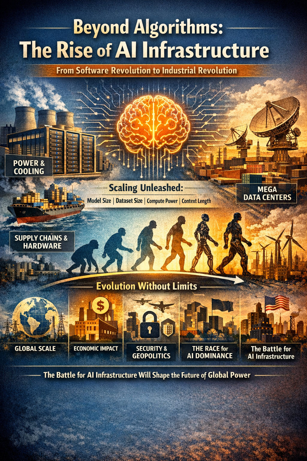 Artificial intelligence is no longer defined by algorithms alone. The real story — the one reshaping geopolitics, economics, energy systems, and the internet itself — is the rise of AI infrastructure. As models scale exponentially, the world is discovering that the limiting factor is no longer mathematical insight or data science talent. It is power, land, cooling, supply chains, and the physical machinery required to sustain intelligence at planetary scale.